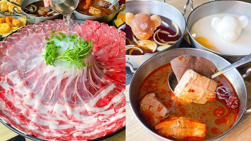鍋底我們選擇了最熱門的壽喜燒鍋,湯頭使用醬油、柴魚、清酒熬煮而成,風味甜中帶鹹,不論涮肉或菜都很適合;起司牛奶鍋需加價$49,裡面有加一整片起司,喝起來奶香濃郁;川味麻辣鍋需加價$49,鍋底添加了多種中藥材與辣椒,辣度溫潤順口不刺激,裡面還有香嫩鴨血、豆腐、酥脆油條。