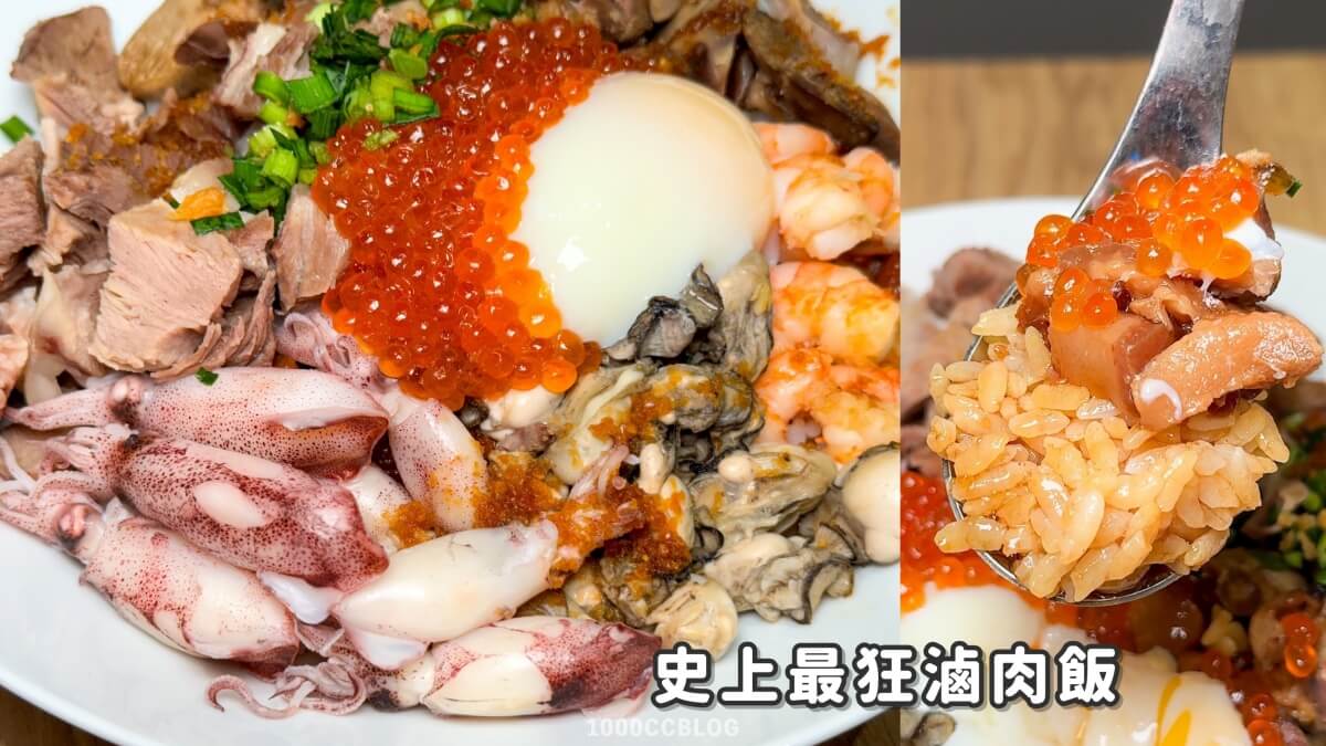 這真的是我這輩子吃過最強的滷肉飯,取名叫山珍海味一點也不過分,配料從海裡到陸上通通有,有鮮蚵、蝦仁、小卷、鮭魚卵、雞下水、豬頭肉,上面還打上一顆溫泉蛋,光是配菜就多到我完全看不到飯,一整個超澎湃。