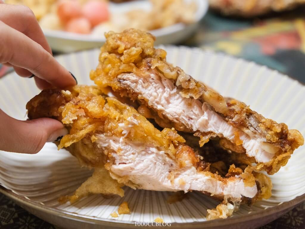 使用台灣飼養的溫體雞肉,加入十八種中藥材醃漬入味,接著裹上麵衣下鍋油炸至金黃,那酥脆到不行的外皮,完美將雞肉的水份給鎖住,口口都是鮮嫩又多汁,厚度也是超實在,好吃!