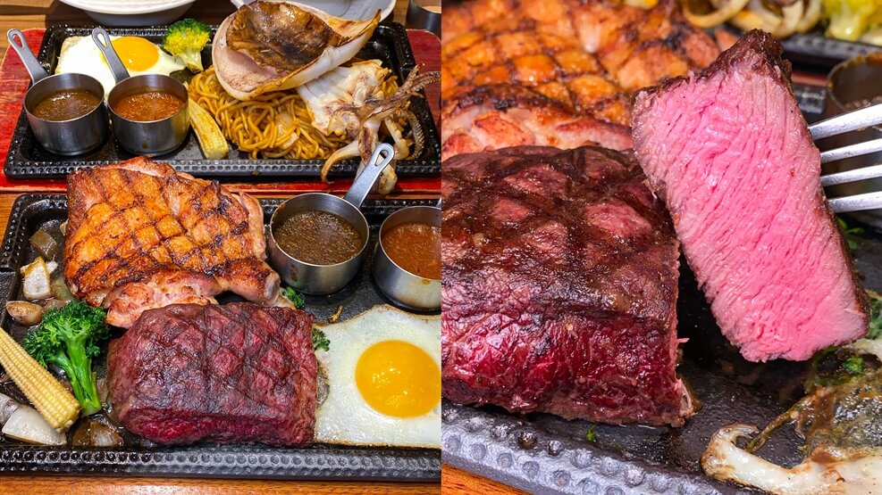 文末提供菜單給大家參考!肉品有牛排、活菌豬、氣冷雞排、軟絲、比目魚排…等,餐點均含附餐(麵或飯食)、湯品、紅茶、沙拉、甜點,其中湯、麵、飯、飲料都是可以無限續點吃到飽的!不得不大讚他們的肉品質很好,尤其是軟嫩多汁的冷藏雪花牛以及外酥內鮮嫩的氣冷雞排,超好吃~整體來說CP值很高,推薦給大家!