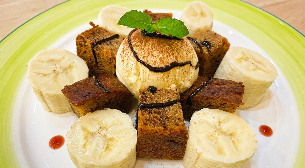 蛋糕部分是香蕉磅蛋糕,一端上桌就散發出清新的天然香蕉香氣,口感還蠻扎實的,整體甜度比例恰到好處,吃再多都不會膩!