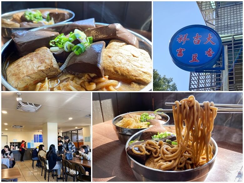 淡水必吃美食之一「大吉祥香豆富」,位於淡江大學周邊,學校旁的餐廳想必都是便宜且CP值高,大吉祥販售單一餐點鴨血豆腐麵,光賣一道餐點就賣得嚇嚇叫,用餐時間座無虛席擠滿了學生,許多淡大學生激推這裡的鴨血豆腐東北麵,麵條Q彈好吃搭配辛辣甘甜的湯頭以及鮮嫩入味的臭豆腐鴨血,一碗80元份量多非常滿足。