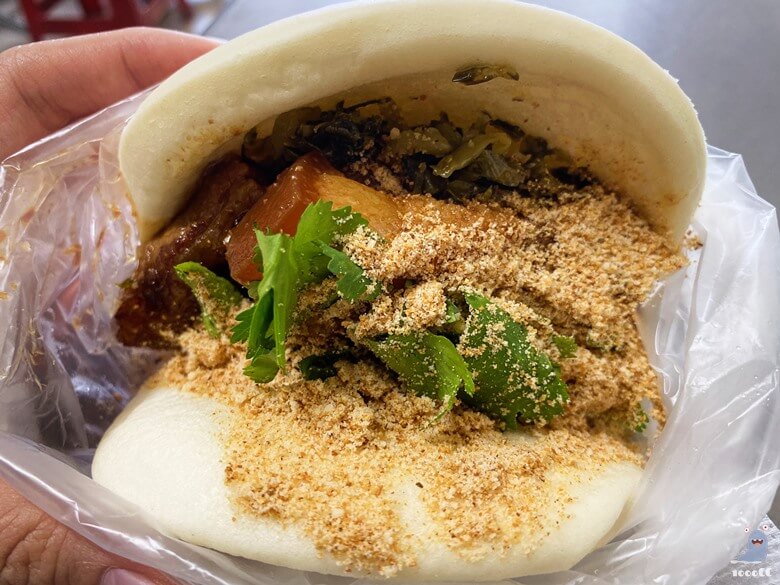 拿在手中熱騰騰的等不及要開動,一打開驚覺這刈包份量真的很大,以酸菜打底加入控肉、花生粉以及香菜,香氣四溢…滿滿的罪惡感呀😋~~傳統的配料就是對味,仔細一看裡頭竟然塞了兩大塊控肉!!! 控肉可以選瘦或肥,不大愛吃肥肉的我選了瘦肉多,控肉整體燉煮得非常入味,不用擔心肥肉部分過於油膩,因為咬下去直接入口即化,一口接著一口三兩下嗑完很有飽足感超級滿足!!! 在烈日下排隊那麼久竟然只買了一個….真是懊悔阿….吃完後好想再吃一個😱。