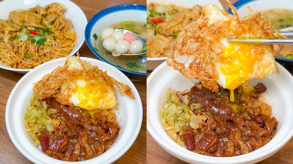 滷肉屬於肥肉大於瘦肉的,滷得很入味又下飯,吃起來鹹中帶甜,入口後不怎麼需要咀嚼,肥肉就會在口中化掉,吃完嘴唇還會黏黏的!將半熟蛋的蛋液拌入魯肉飯中一起享用,口感會更滑順且濃郁,這樣吃真的超銷魂!炸蛋也可以選全熟的哦。